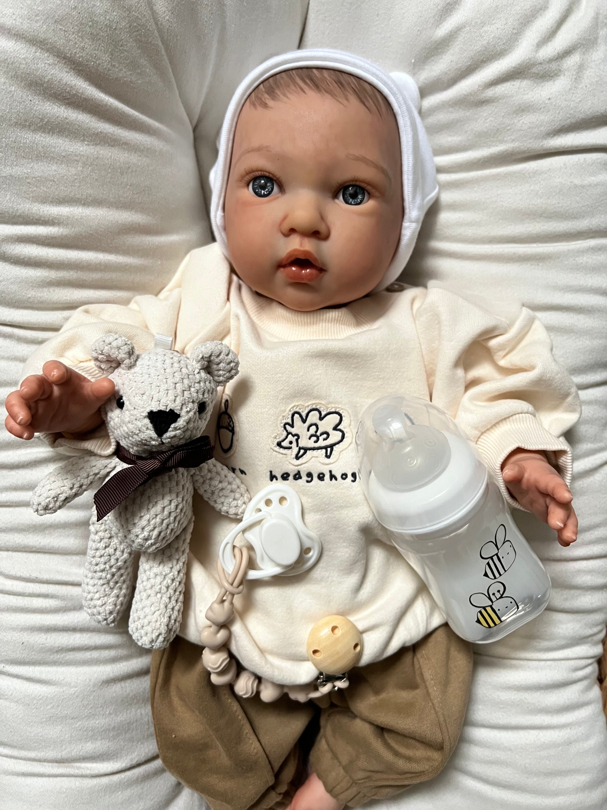 Weighing around 5lbs (2.3kg), Lainey has a soft doe-suede body with disc-jointed limbs, allowing for gentle posing and natural cuddles. Every detail — from her hand-painted skin tones to her soft blushing and delicate features — has been created with care to capture a truly lifelike newborn feel.