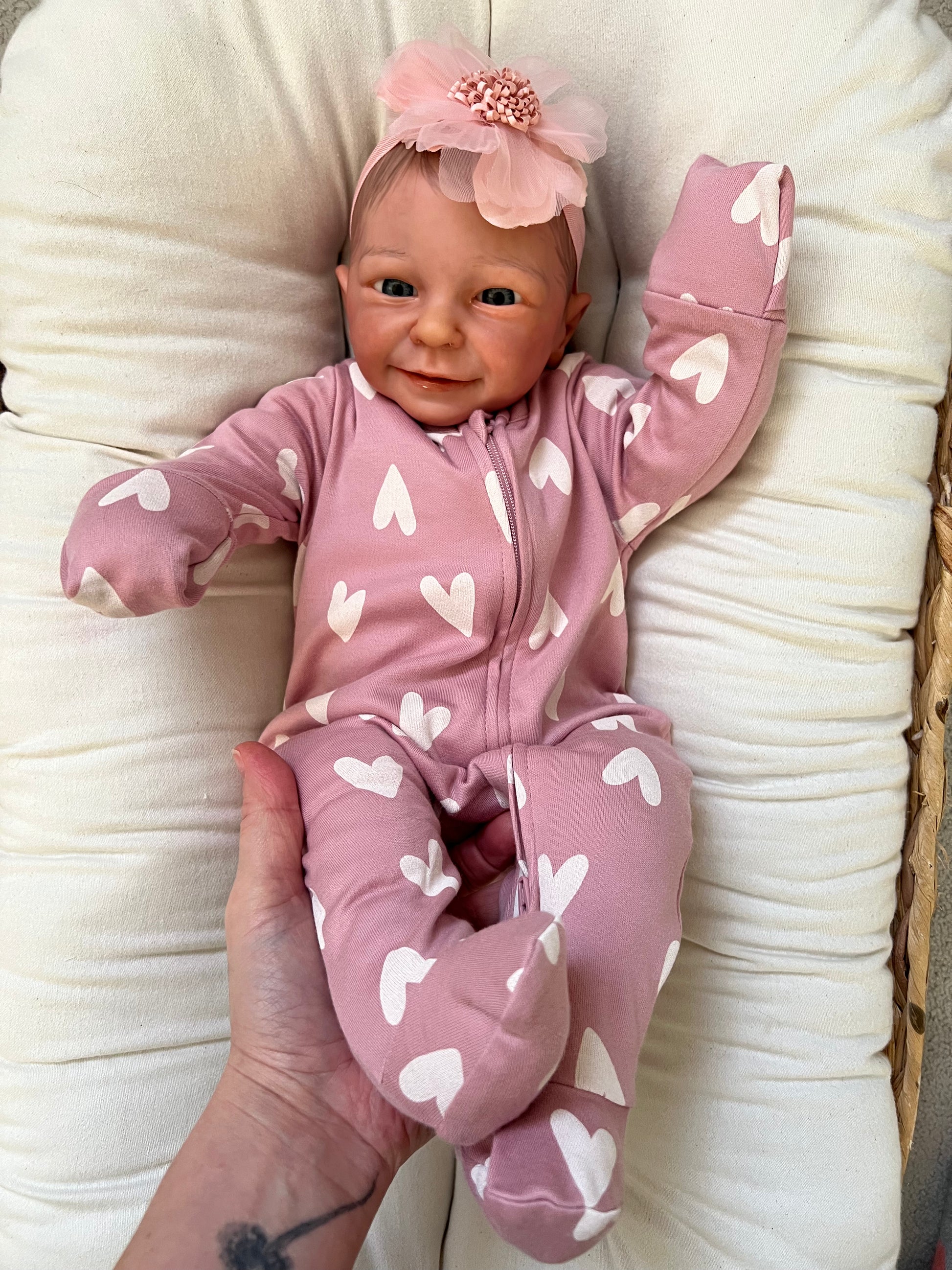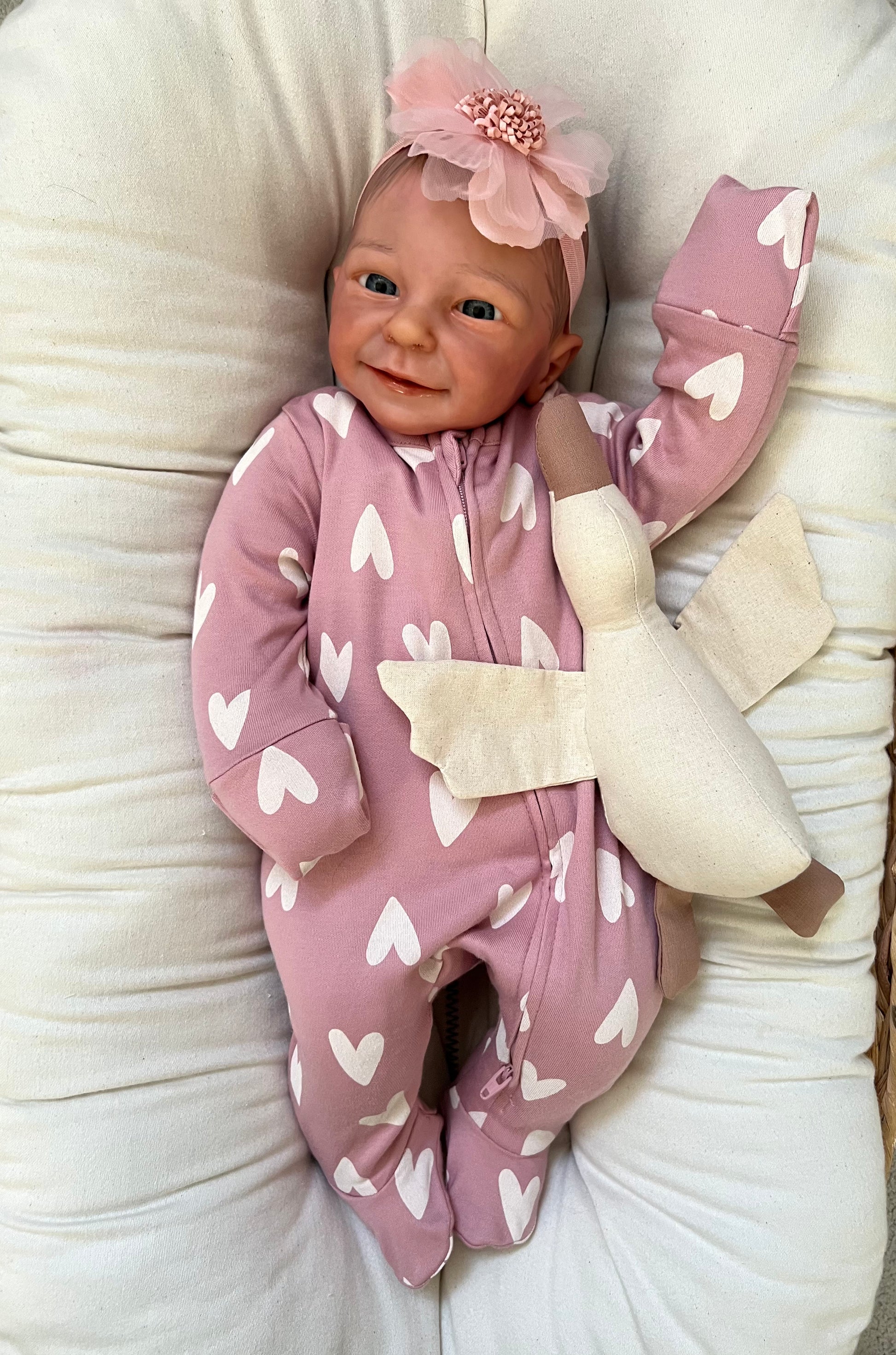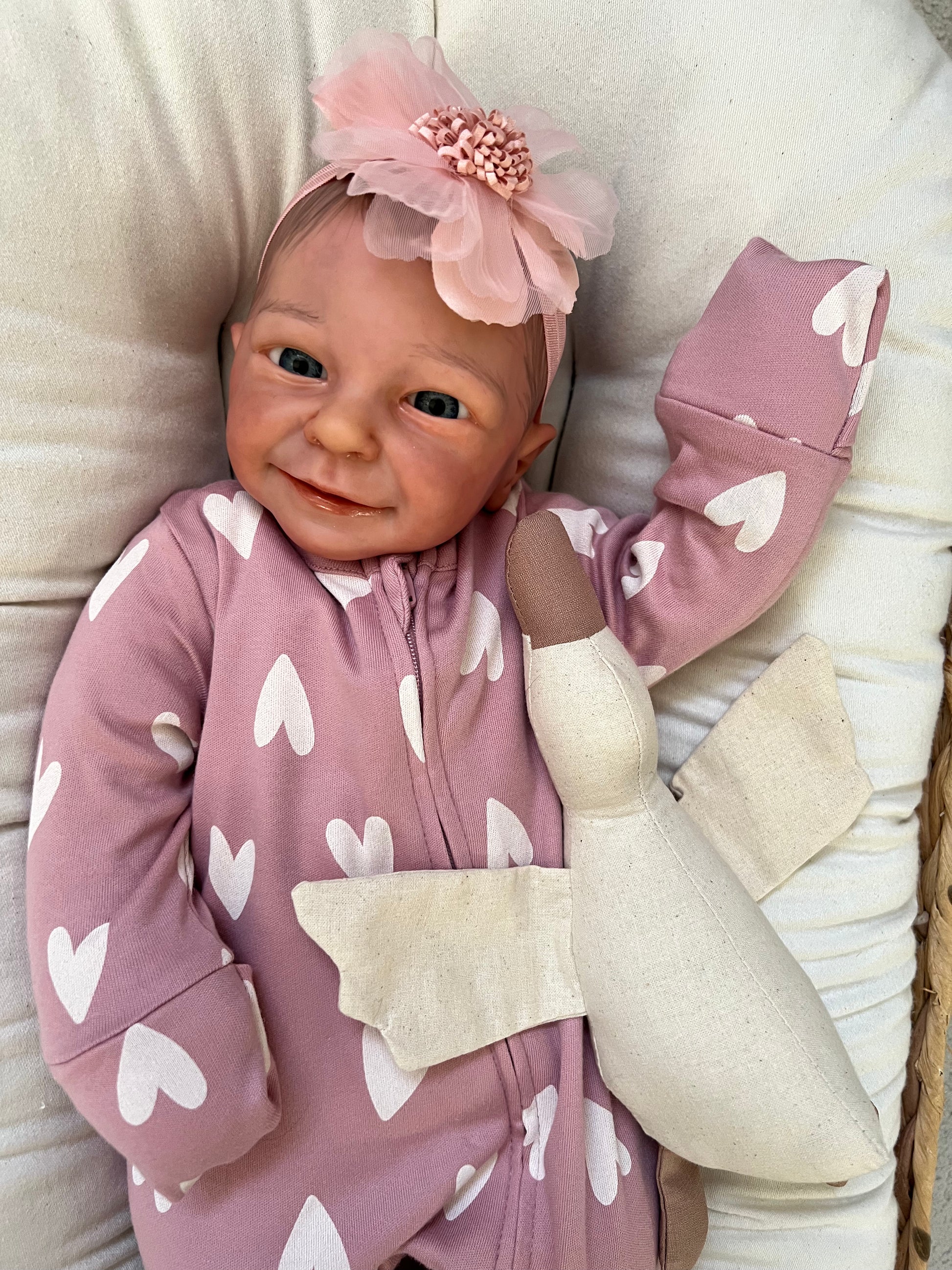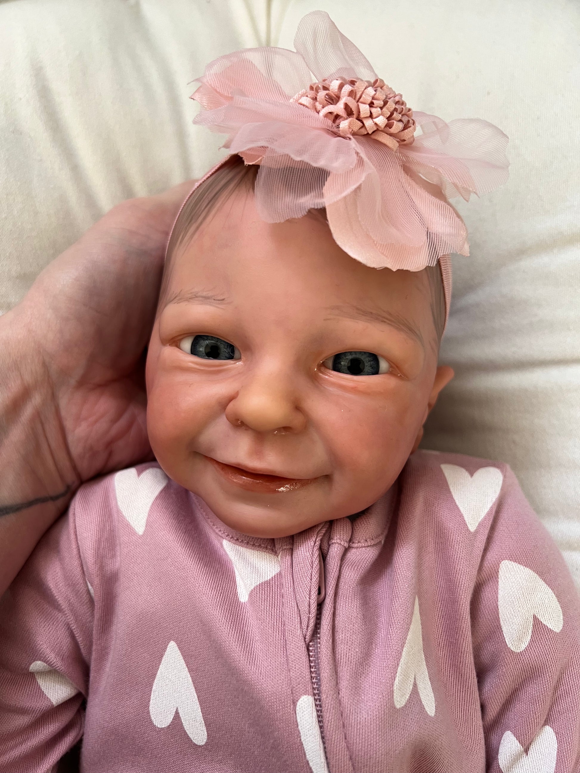Weighing around 5lbs (2.3kg), Rieke has a soft doe-suede body and limbs, allowing for gentle posing and natural cuddles. Every detail — from hand-painted skin tones to soft blushing and delicate features — has been created with care to capture a truly lifelike newborn feel.