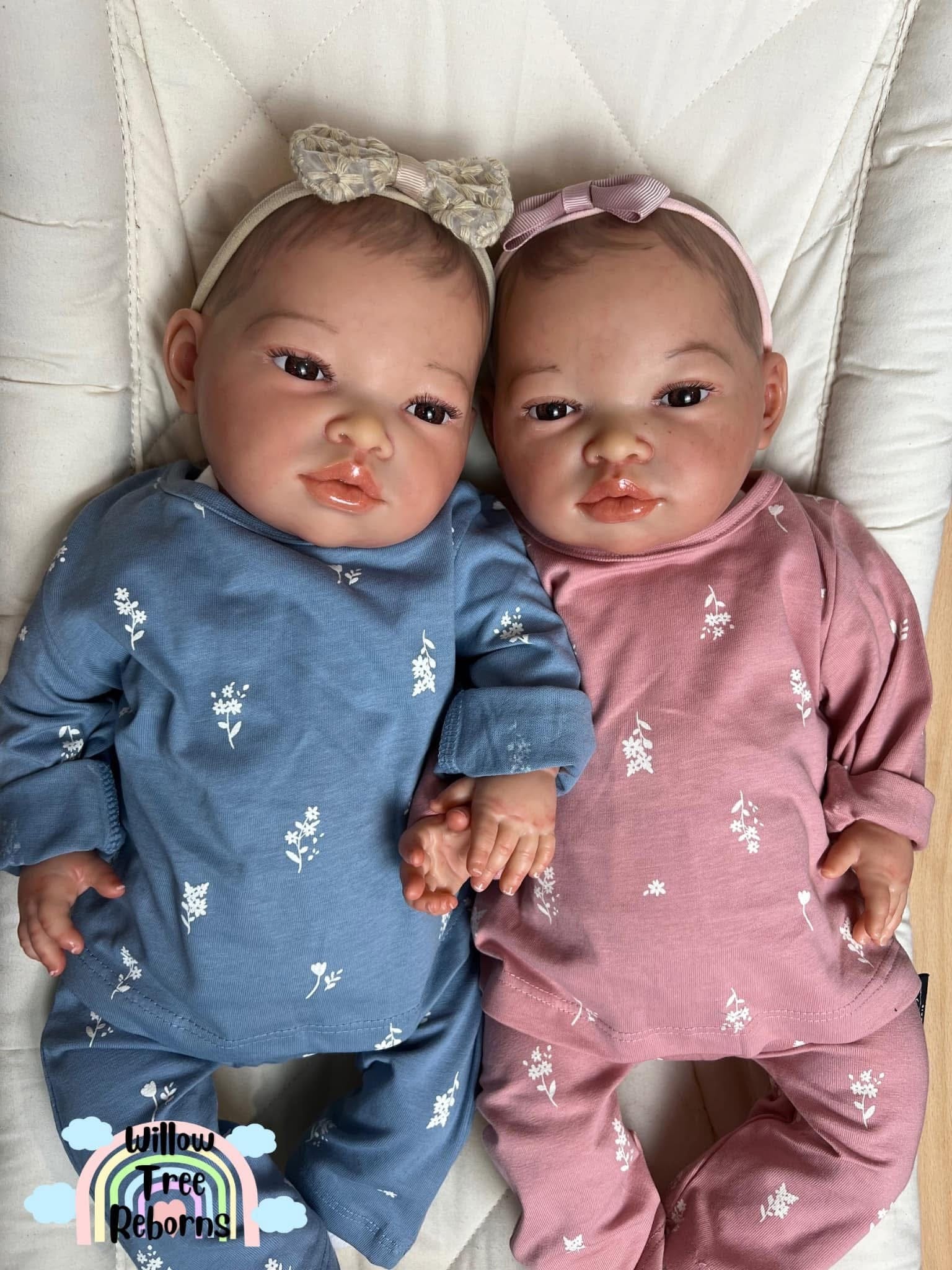 A adorable pair of 19-inch realistic reborn baby dolls by Nines d’Onil lovingly painted by Willow Tree Reborns and can be customised as any combination of gender and hair colour — two girls, two boys, or one of each.